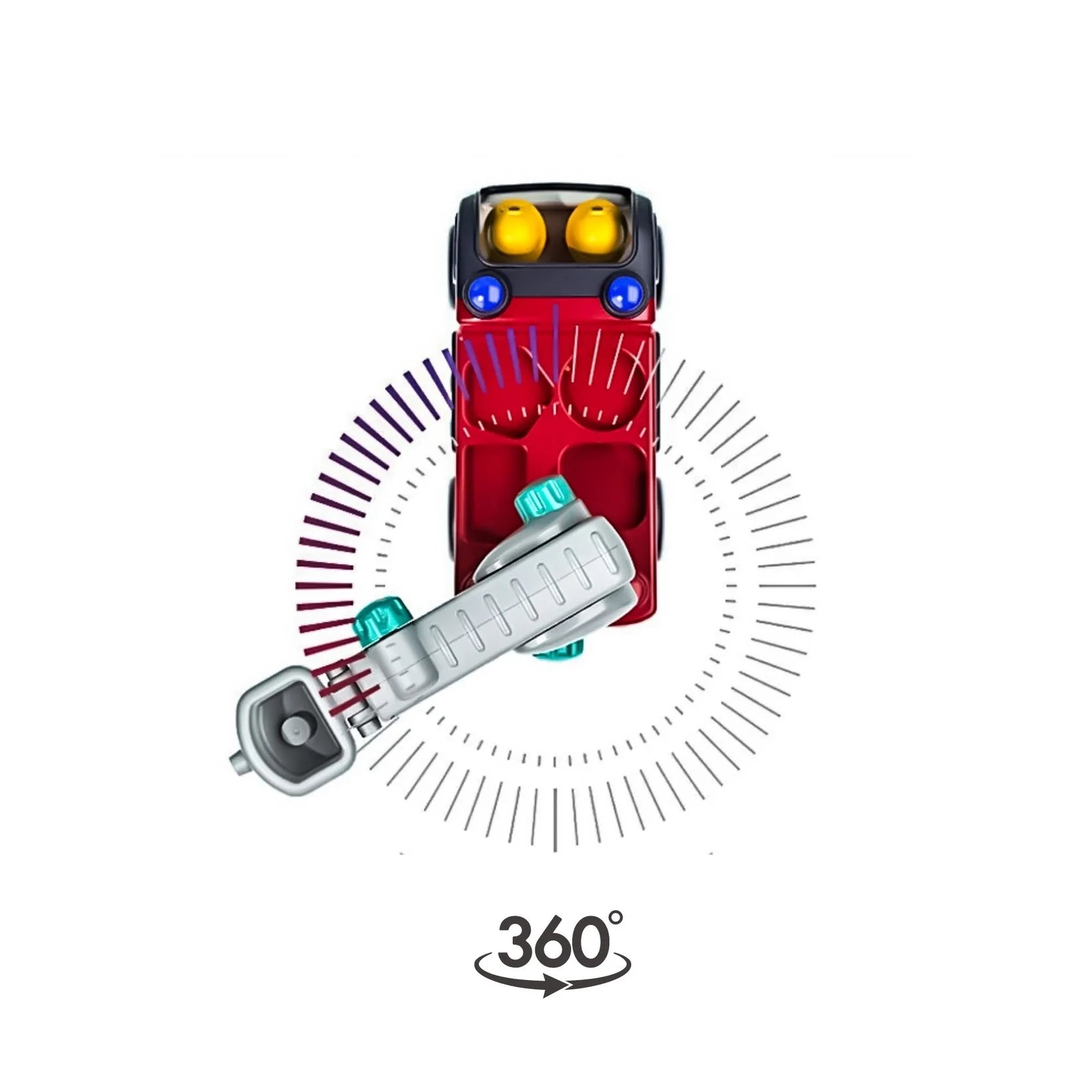 In addition, the 360° rotatable ladder on the back is extendable and can hold a fireman. Simply, turn the wheels to adjust the length, height, and direction of the ladder.