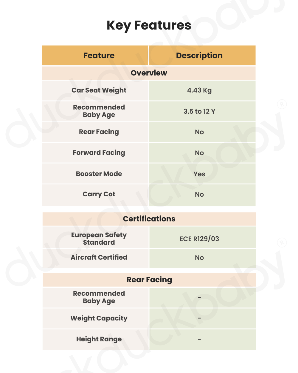 This space-saving i-Size belted booster seat combines advanced safety features with sleek, compact design. Certified to meet the highest R129 safety standards, including i-Size approval, it ensures side impact protection and a perfect fit in i-Size approved vehicles. Ideal for growing families, it comfortably accommodates three seats across the backseat of compatible vehicles and provides effortless adjustments with a 10-height headrest.Experience Unmatched Features