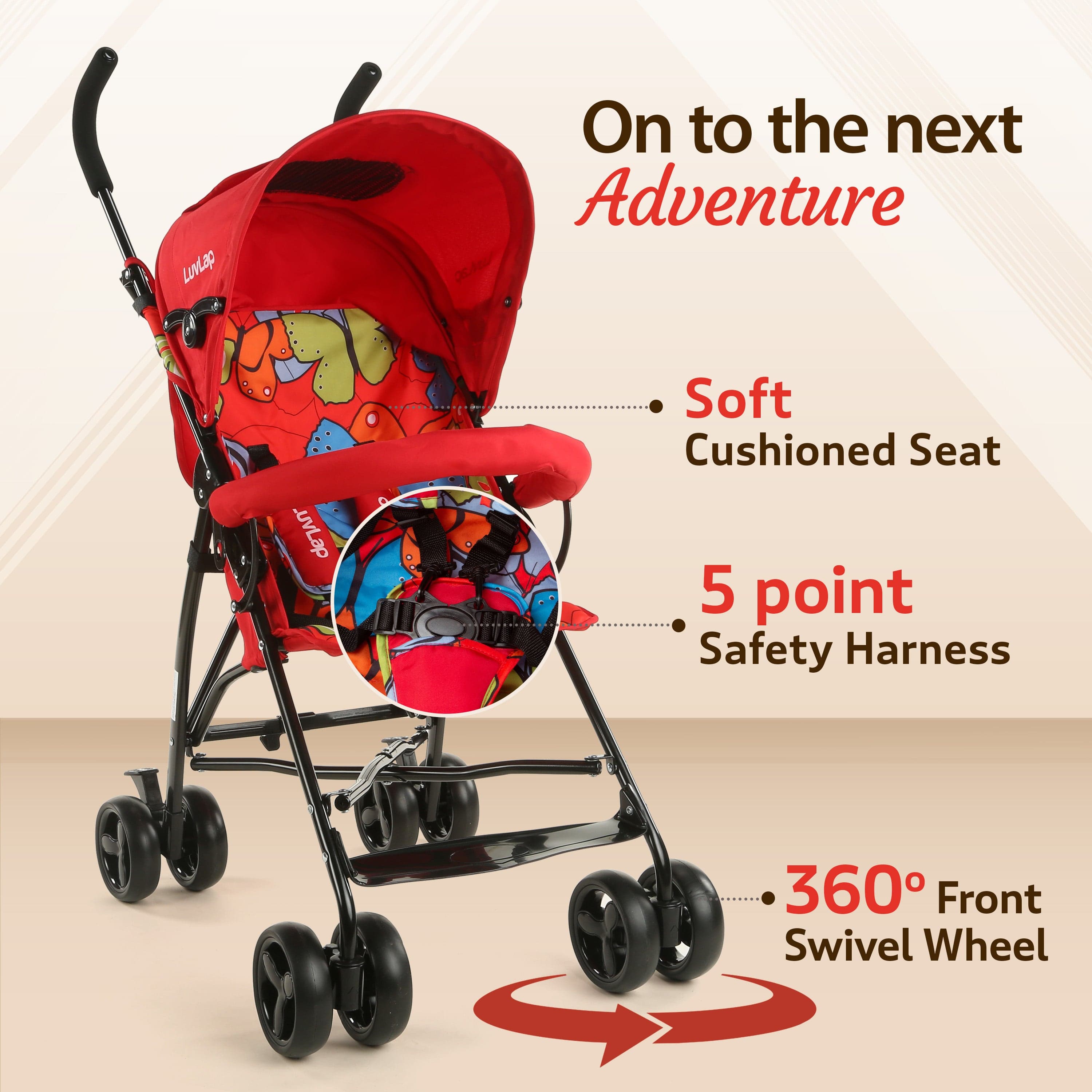 Crafted with a sturdy yet lightweight frame, the LuvLap stroller ensures easy maneuverability while keeping your little one safe and secure. The soft cushioned seat offers optimal comfort, while the adjustable reclining backrest allows your baby to sit, relax, or nap peacefully on the go.